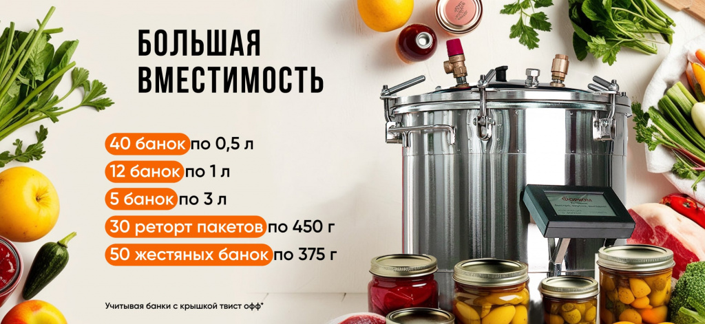 Объём 46 литров позволяет загружать до 40 банок по 0,5 л или 12 банок по 1 л за один цикл. Удобно работать как со стандартными стеклянными банками, так и с жестяными консервными банками и реторт-пакетами. Это даёт возможность делать универсальные заготовки: от мясных тушёнок до соков, овощных салатов и компотов.