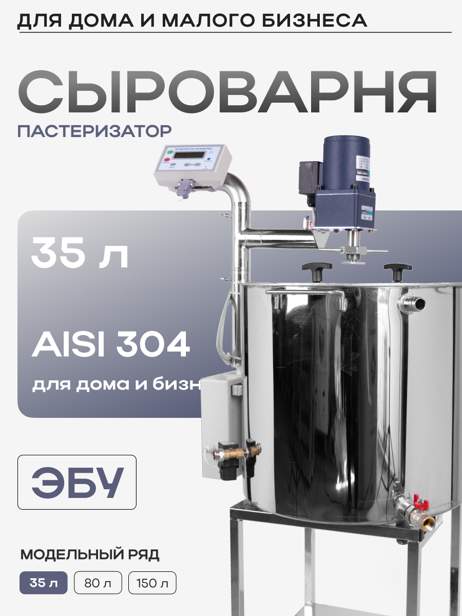 Бак на 35 литров позволяет одновременно перерабатывать крупную партию молока, что делает модель удобной для небольших сыроварен, ферм и домашних хозяйств. Это золотая середина между компактностью и производительностью.